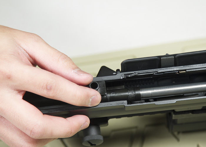 - Slide the inner barrel (now with the bucking) into the hop up unit. (Trench is on the bottom)