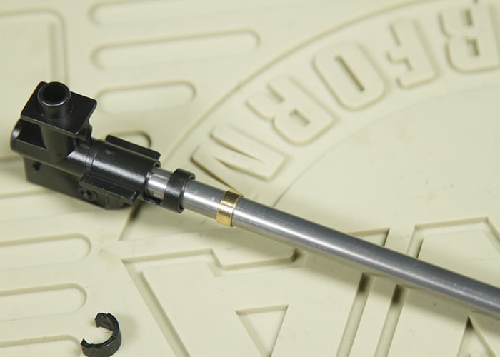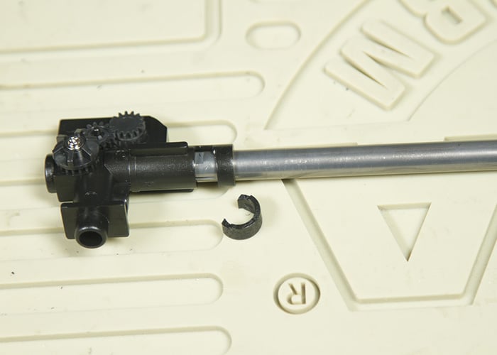 - Remove the C-Clip (which retain the barrel in the hop up unit), located on the bottom of the hop up unit.