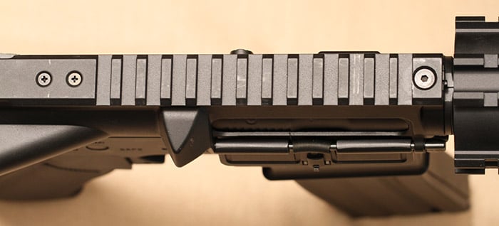 The ICS Full Metal M4 has a standard metal receiver. The one in the photo features a folding stock, which is a nice feature if the operator needs to go into a really confined space such as vehicles. The metal carrying handle can be removed to expose the 1913 picatinny rail and mount optics on to it. A unique feature of the ICS M4 that you might not be aware of is the forward assist button, on the right side of the upper receiver, functioning as a spring release. ICS is the company that invented this awesome idea, which can prolong the life of the spring.
