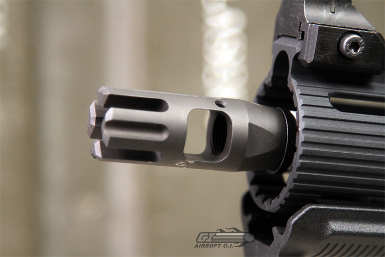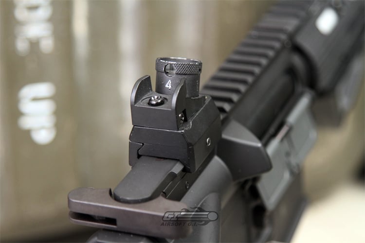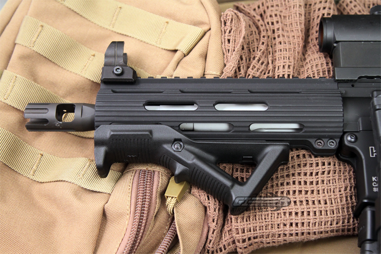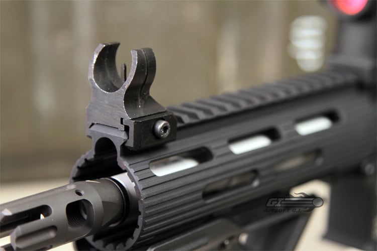 For the rail, Frank chose the excellent Madbull Troy VTac Rail. This rail’s unique design helps save weight and increase ergonomics because it is skinnier and it allows the operator to add or remove rails. To further increase ergonomics, Frank chose to install the Magpul AFG (Angle Forward Grip). Frank chose the HK416 style sights for their lower profile and easy accessibility. Finally, Frank chose the Rainier Arms flash hider to give it the ultimate bad ass look.