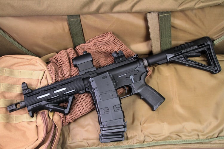Starting from the rear of the gun, the Rapid Response Weapon features a Magpul MOE (Magpul Original Equipment) butt stock. The MOE is famous for its superb durability, and it adds a unique look to the weapon. Next up, Frank installed the Magpul MIAD grip. Not only does the MIAD grip give the gun a “tacticool” look, but it also increases the ergonomics of the weapon. Everyone knows that Magpul manufactures the best shooting accessories in the firearm industry. Therefore, the R.R.W. comes with a set of Magpul P-Mags with the M.F.T. (Mission First Tactical) magazine clamp. This will decrease the operator’s reloading time and increase his/her survivability.