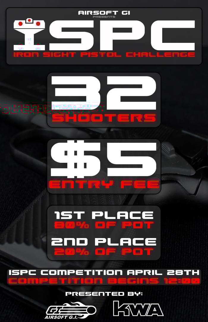 This is the first ever Airsoft GI Iron Sight Pistol Challenge and it’s being held at the Airsoft GI Retail Store in Walnut, CA. This pistol challenge is set up similar to other sporting event tournaments. Thirty two total shooters will battle head to head in a single elimination tournament until there is only one shooter left, the champion! Put your shooting skills, weapon manipulation and nerves to the test and sign up for the Airsoft GI ISPC!